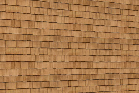 New England pine shingles laid in an overlapping pattern over a solid masonry (block or poured concrete) exterior wall.